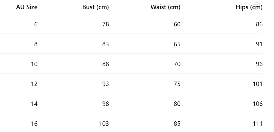 Please refer to the measurements below to find your perfect size. All measurements are in centimeters.